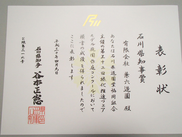 モデル庭園受賞「石川県知事賞」 2018 4/09 その他 2018.04.09 2018.04.09 石川県造園業協同組合主催の第32回緑化推進フェアにおいて、モデル庭園の作庭を行い「石川県知事賞」を受賞しました。 その他 湯涌江戸村旧平尾家住宅植栽工事 アルミフェンス 関連記事 金沢匠の技能士認定 2014.09.30 モデル庭園受賞「金沢市長賞」 2021.04.03 門松作成 2019.12.28 歴史的建造物修復士認定 2017.09.30 三世代造園技能士家族表彰 2013.05.24 除雪作業 2021.01.13 町屋巡遊2016庭園案内 2016.09.22 巨木の移植 2019.03.30