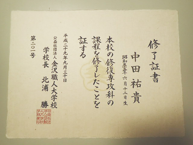 歴史的建造物修復士認定 2017 9/30 その他未分類 2017.09.30 2017.09.30 金沢市長より金沢職人大学校「修復専攻科」を終了したため、認定を受けた。 OLYMPUS DIGITAL CAMERA その他未分類 塩ビ竹垣 金沢市匠の技顕巧賞 関連記事 金沢市匠の技顕巧賞 2018.01.25 三世代造園技能士家族表彰 2013.05.24 門松作成 2019.12.28 巨木の移植 2019.03.30 モデル庭園受賞「石川県知事賞」 2018.04.09 町屋巡遊2016庭園案内 2016.09.22 金沢匠の技能士認定 2014.09.30 除雪作業 2021.01.13