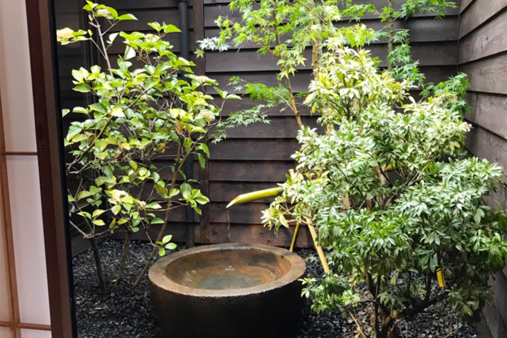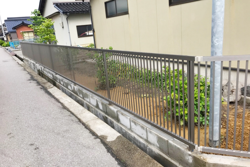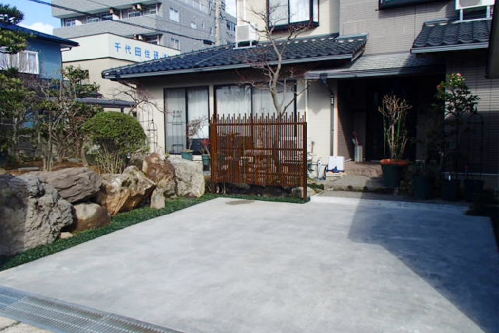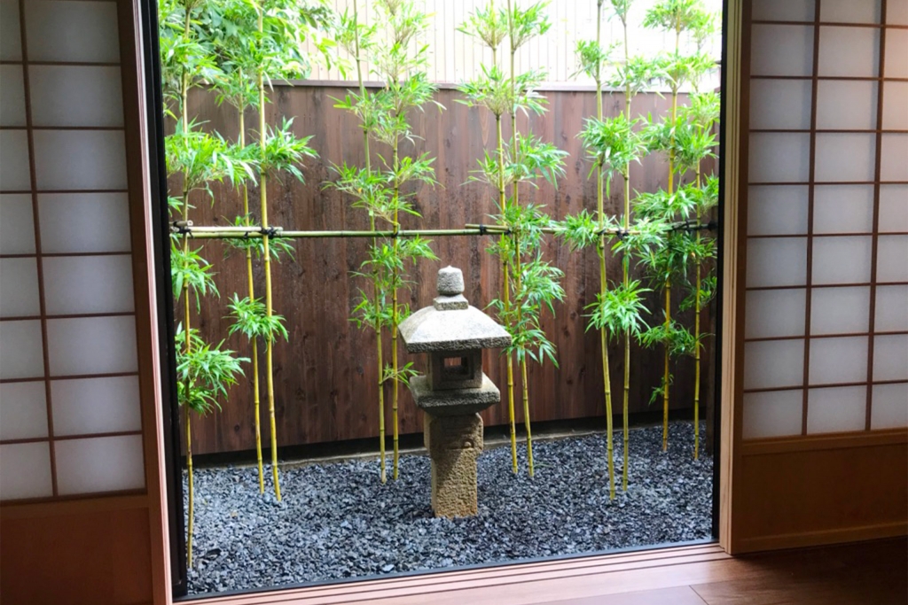 玄関先に天然の竹で金閣寺竹垣を作成しました。また、目隠しで、塩ビの板塀を作成しました。 -