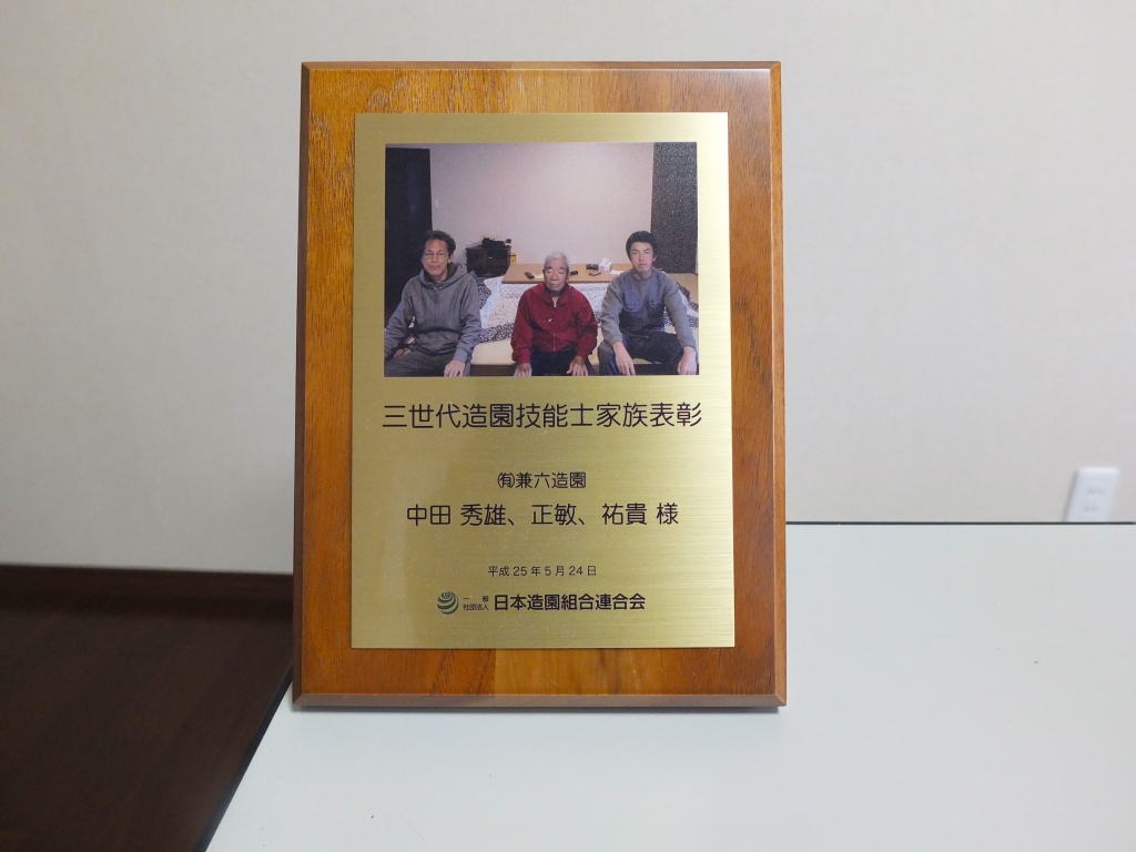 2013年 三世代造園技能士家族表彰を受賞(中田秀雄、正敏、祐貴)